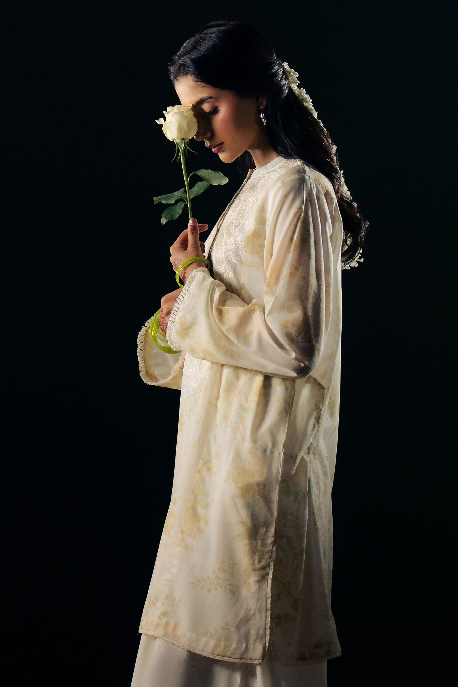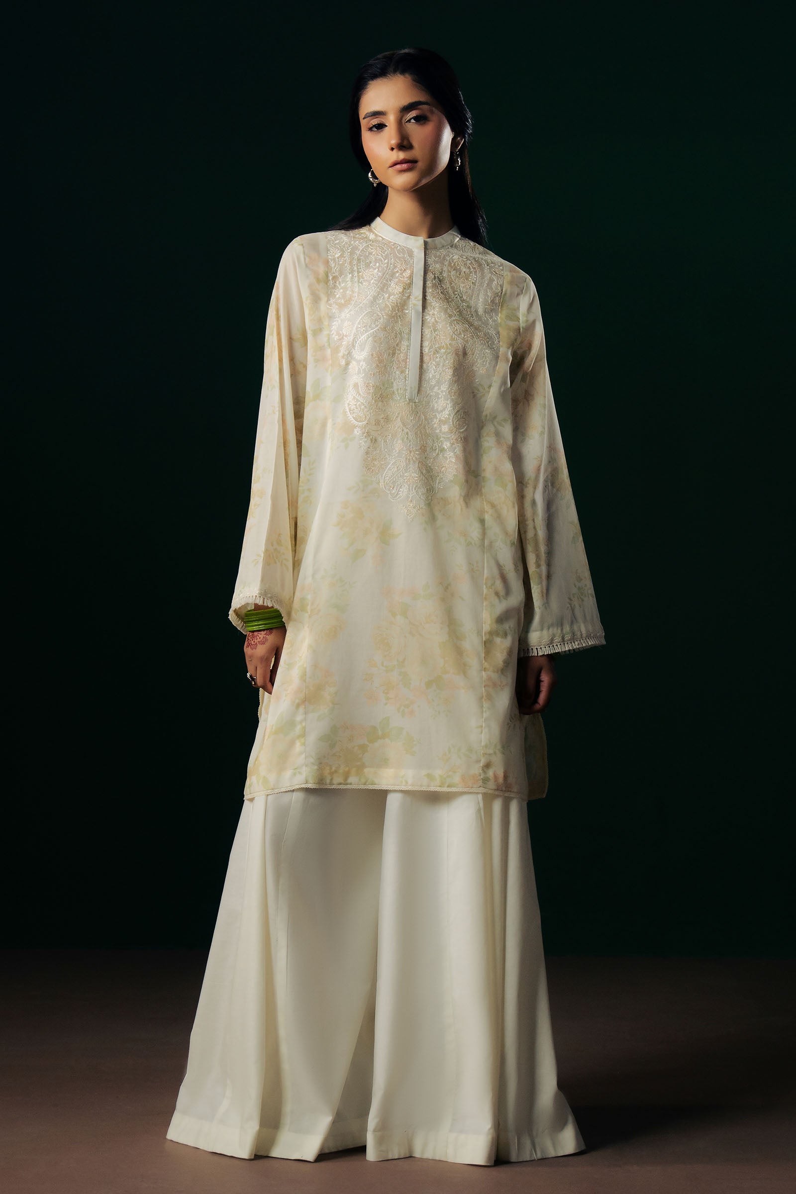 Mehak is a short-length printed kurta that radiates fresh, light, and effortless charm. The soft pastel base features a soothing, feminine print, creating a gentle and elegant aesthetic. An intricately embroidered neckline adds a touch of artisanal craftsmanship, while subtle embroidery accents on the sleeves complete the design with refined, thoughtful detail.