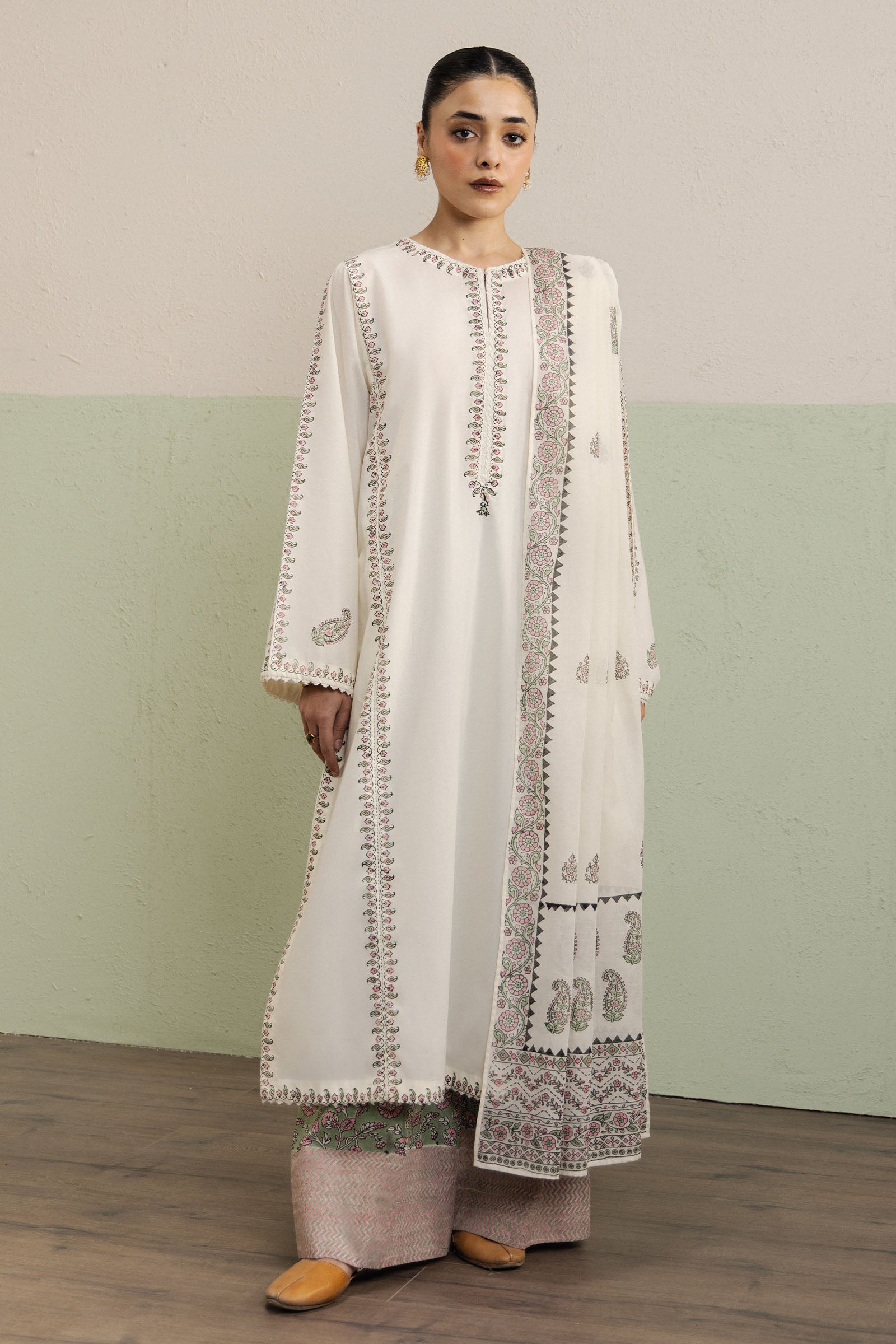 Meher is an off-white, three-paneled voile kurta, with each panel exquisitely enhanced with handcrafted intricate borders. The composed sleeves are finished with delicate crochet lace, adding a touch of refined elegance. Paired with a contrast-colored cambric farshi shalwar, featuring an accent-colored chevron decorative border at the bottom opening, the ensemble balances grandeur with contemporary wearability. The swiss voile dupatta is adorned with a four-sided border and double borders along the pallus, elevating the overall festive charm and flowing silhouette.