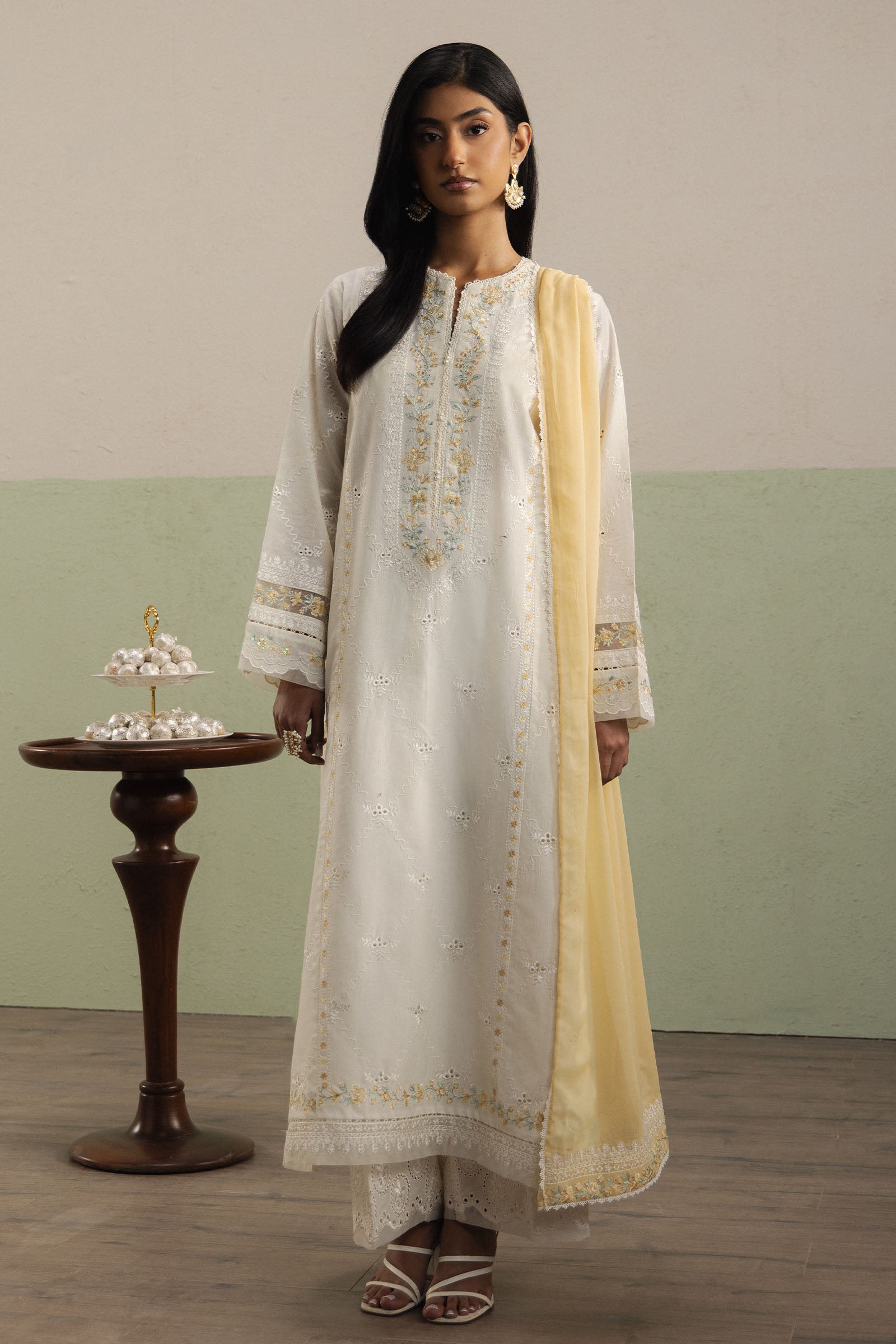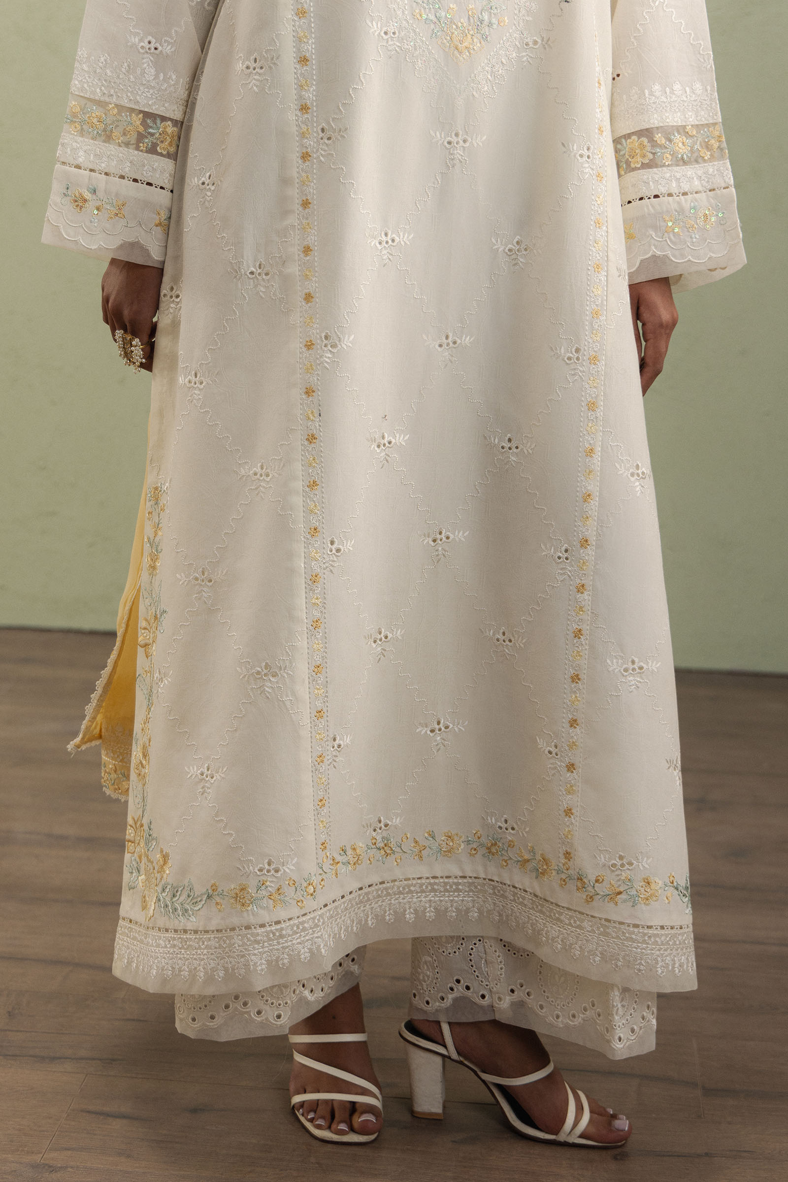 Mahvash is a graceful long white dobby shirt, adorned with delicate boring and Gara-style embroidery in soft pastel yellow on both the shirt and matching dobby trousers, creating a subtle and elegant festive charm. Paired with a lightweight yellow georgette chiffon dupatta, the ensemble exudes a soft, radiant warmth and adds a playful yet refined splash of color.