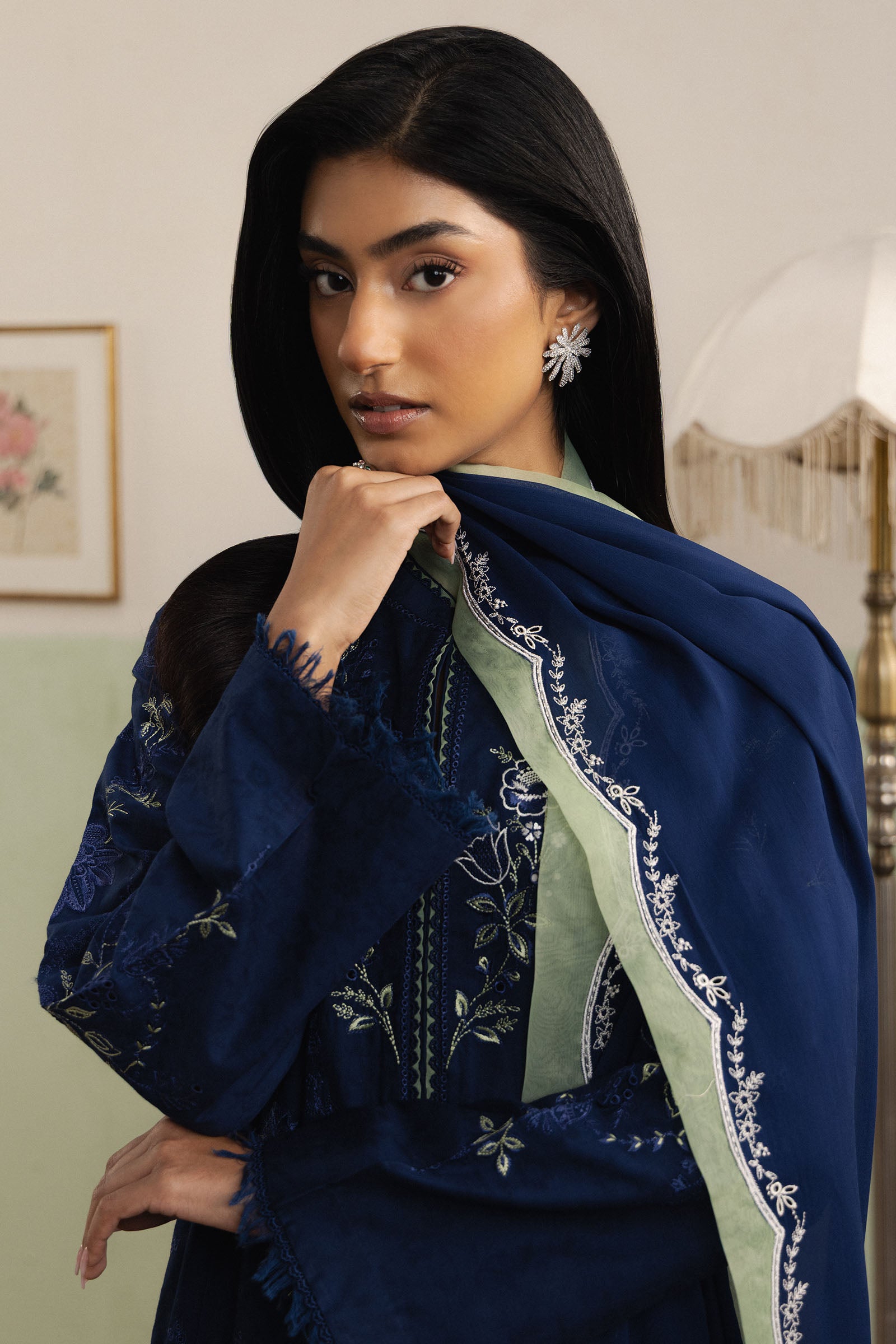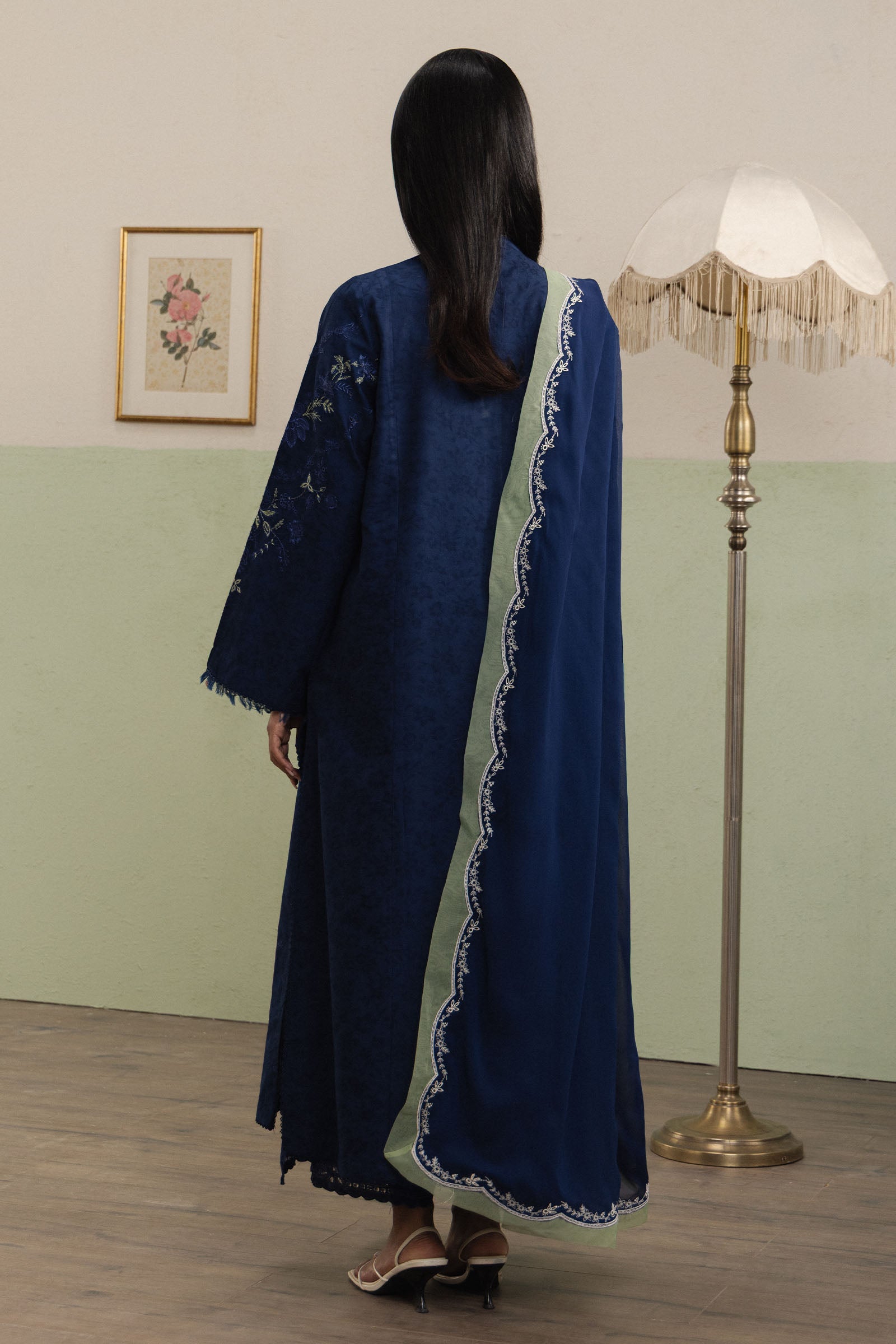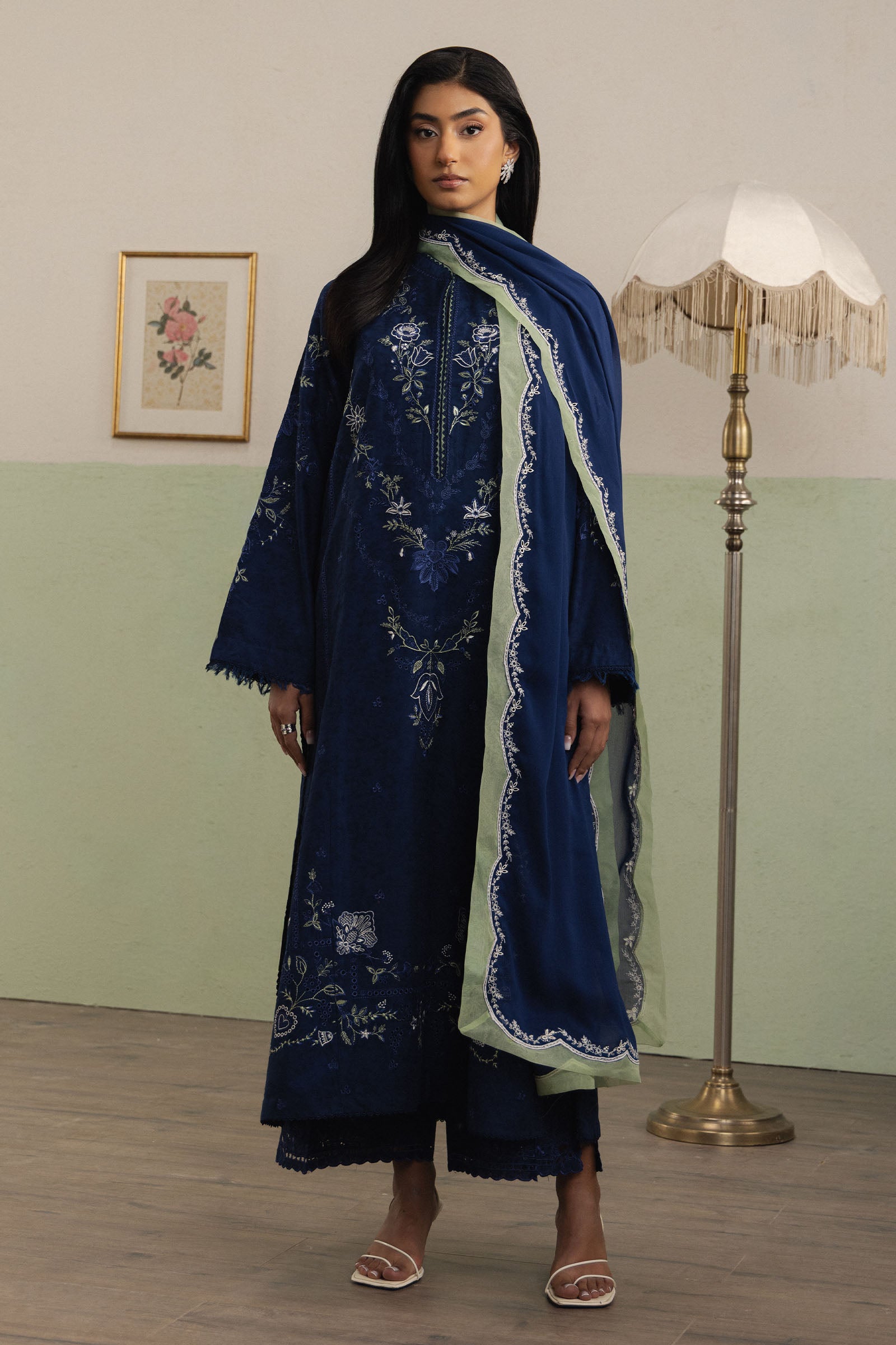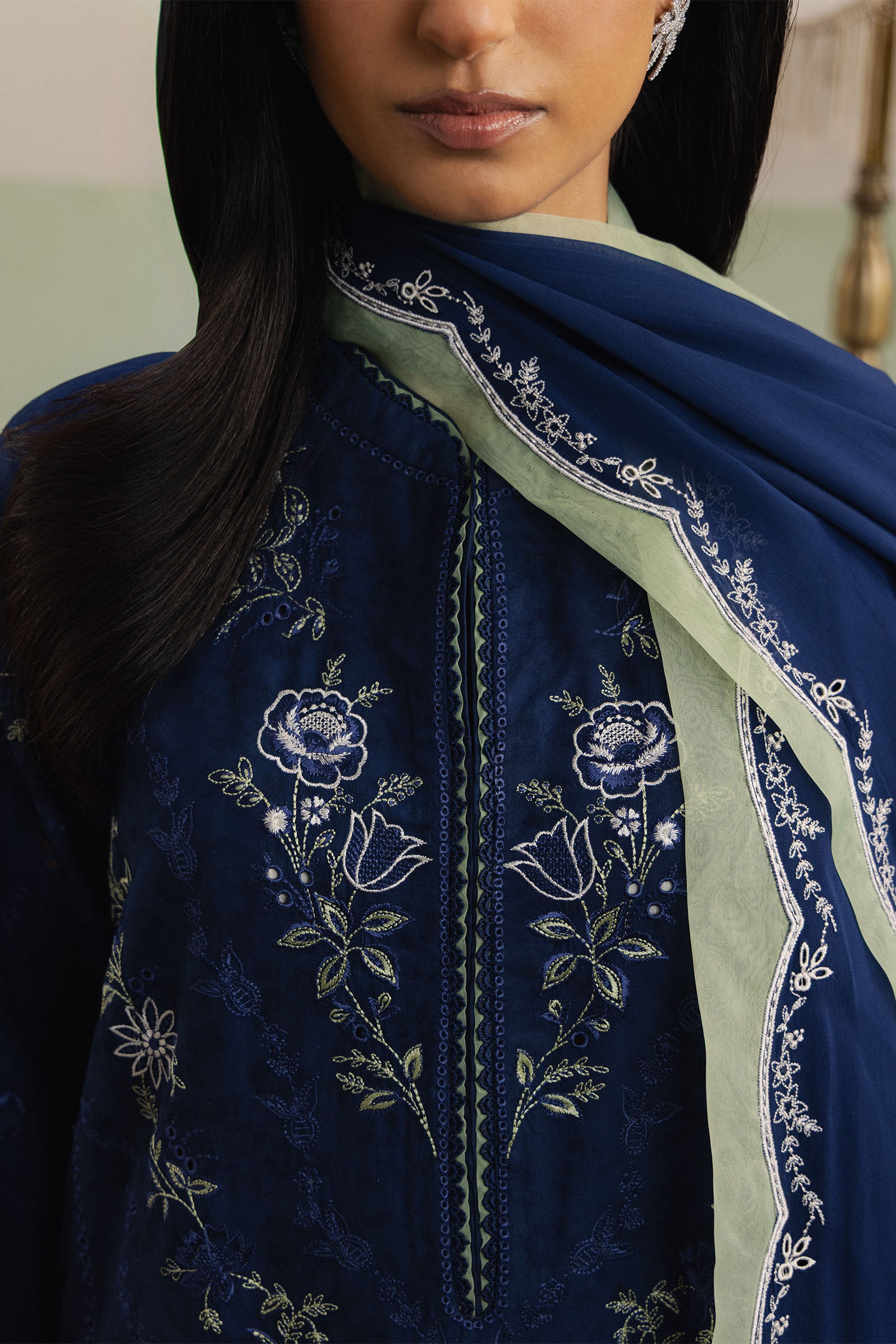 Saahil is a long navy blue dobby shirt, beautifully adorned with delicate Schifli embroidery in soft green and white, adding subtle contrast and refined charm to the silhouette. Paired with cutwork dobby culottes in matching navy blue, the ensemble balances intricate detailing with modern comfort. A matching navy blue georgette chiffon dupatta completes the look, lending graceful flow and understated festive elegance.