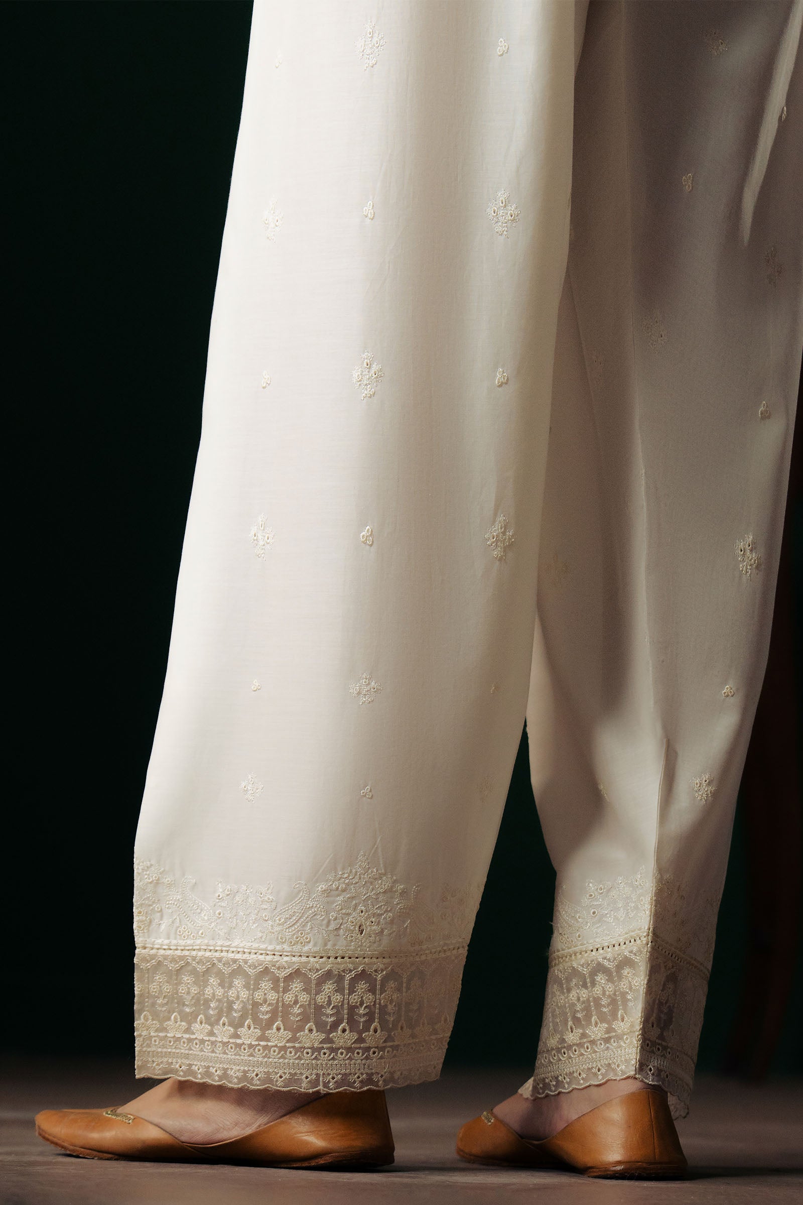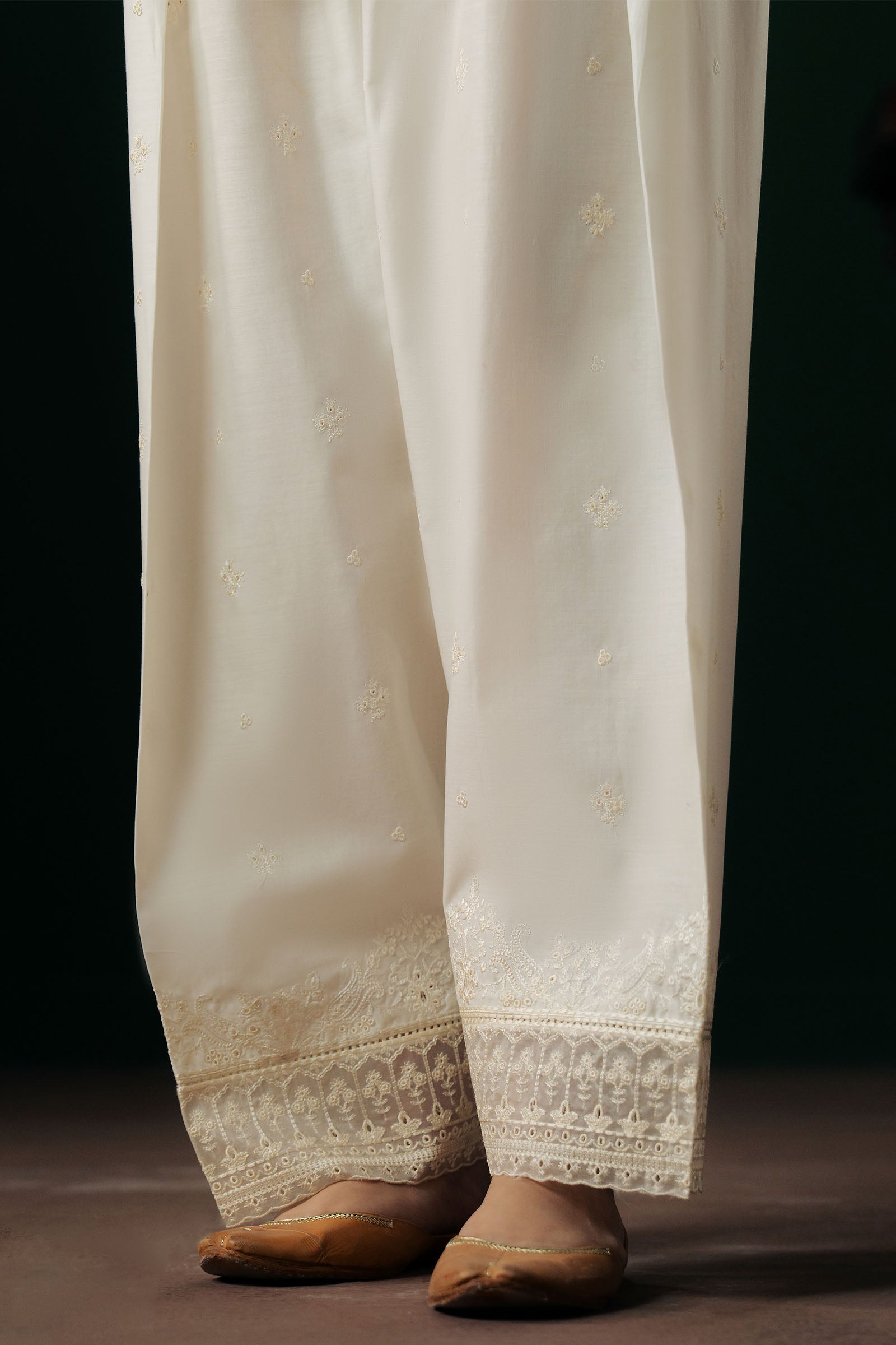 Safaa is a classic ivory regular shalwar designed for effortless comfort and timeless style. The hem is finished with delicate embroidered borders, while subtle boti sprays scattered across the fabric add a touch of understated elegance and charm.
