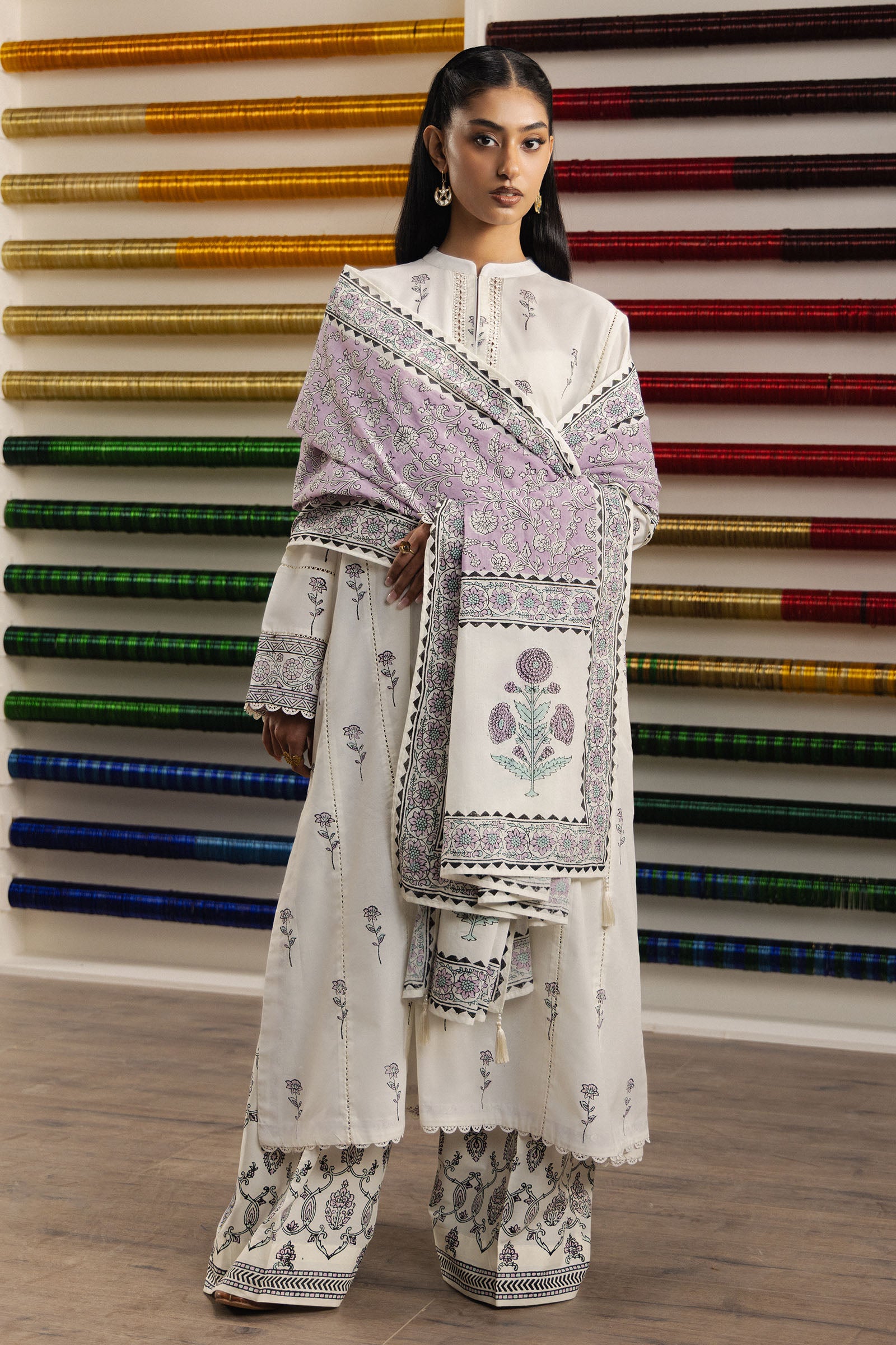 Hunar is an off-white, three-paneled voile shirt, delicately adorned with lace insertions along the neckline, sleeves, and panels, creating an airy yet refined silhouette. The cambric culottes feature subtle decorative border detailing, adding modern comfort and understated charm. The swiss voile dupatta, finished with a four-sided border and tassel accents at each corner, completes the look with ethereal grace.