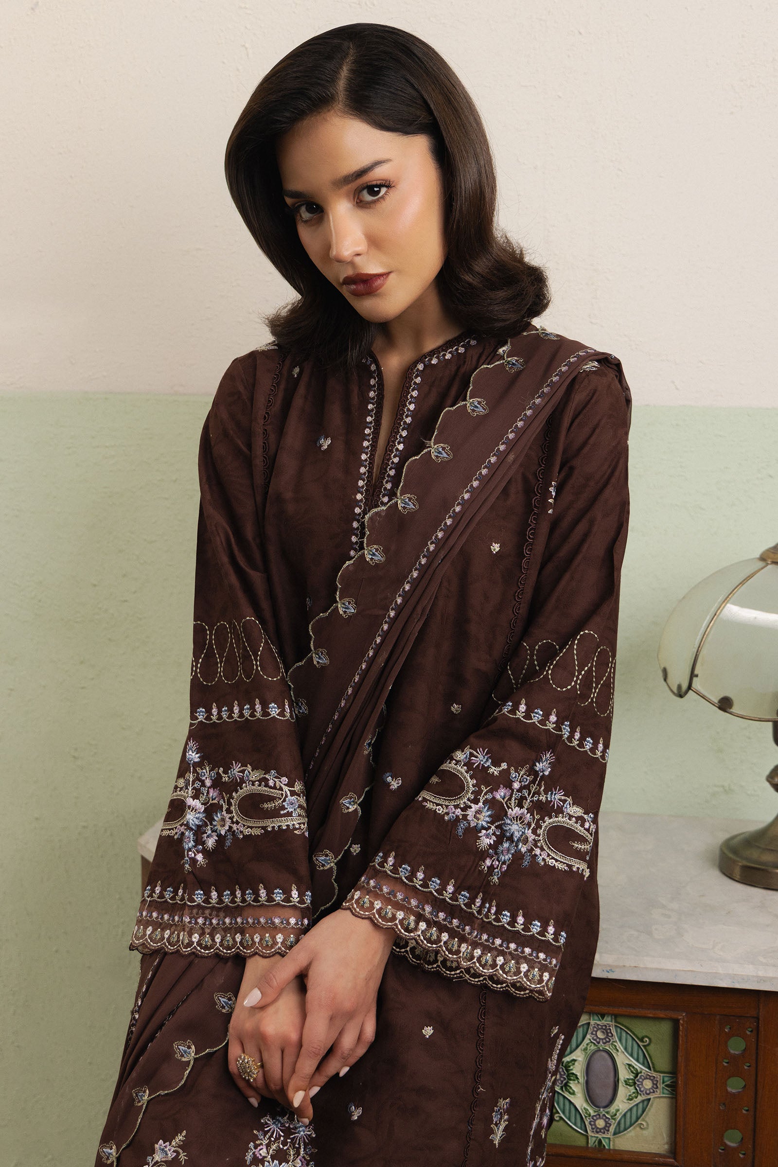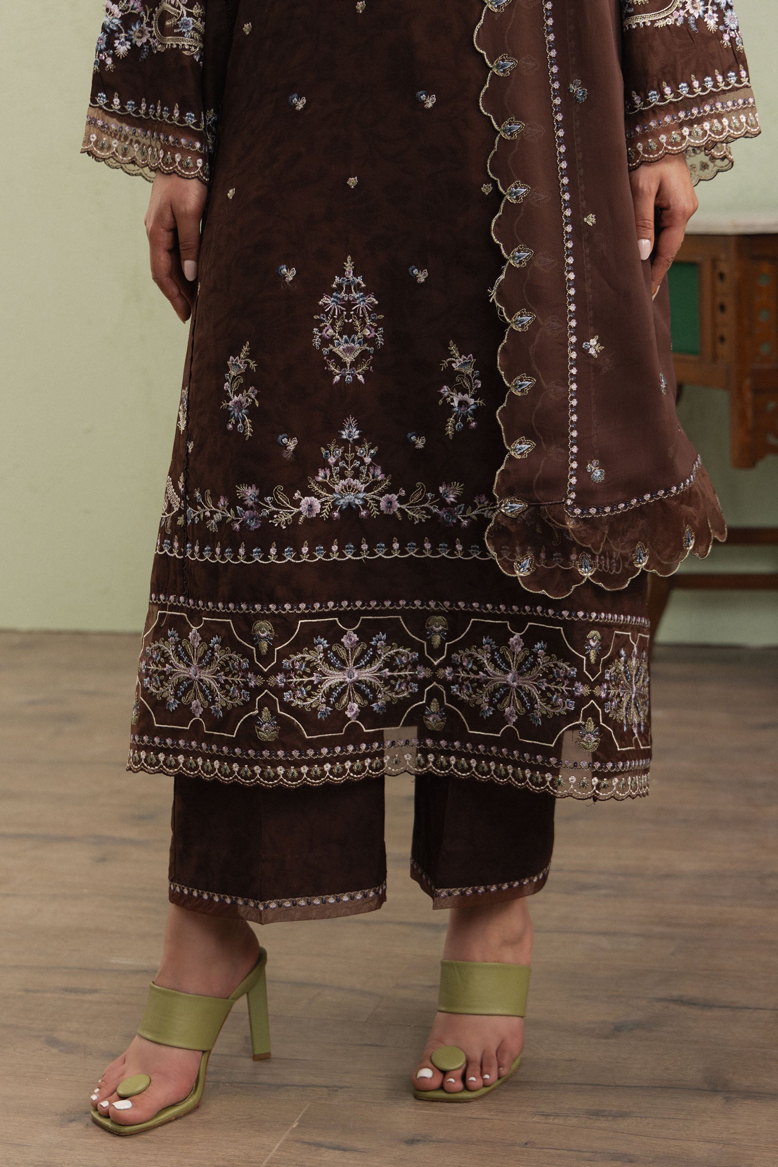 Kaafiya is a loose-fit, long brown jacquard shirt, featuring intricate Kantha embroidery across the front that highlights artisanal craftsmanship and adds subtle texture. It is paired with straight jacquard pants finished with delicate embroidery, enhancing the refined silhouette. A soft georgette chiffon dupatta completes the ensemble, maintaining a balanced, understated elegance.