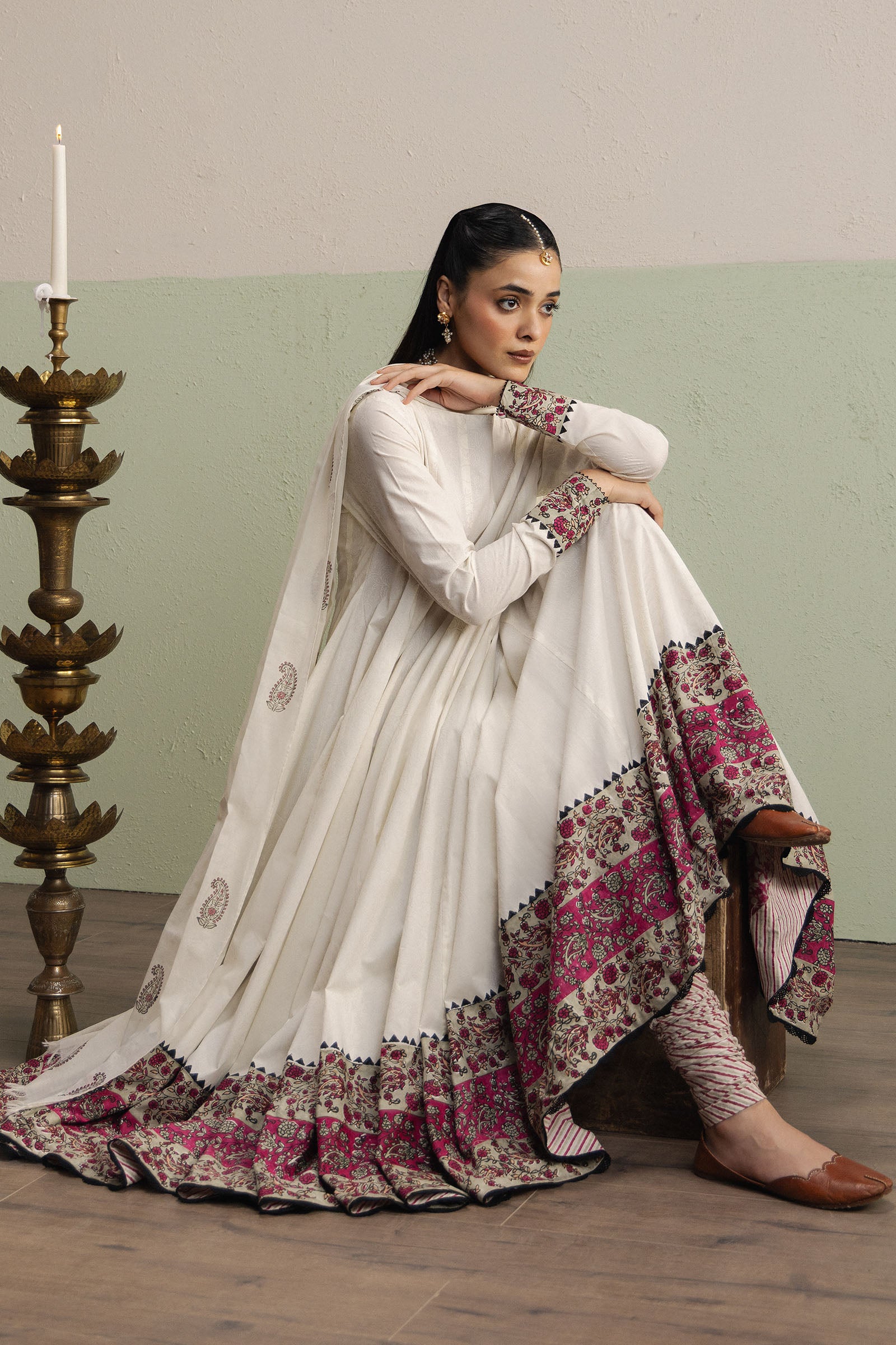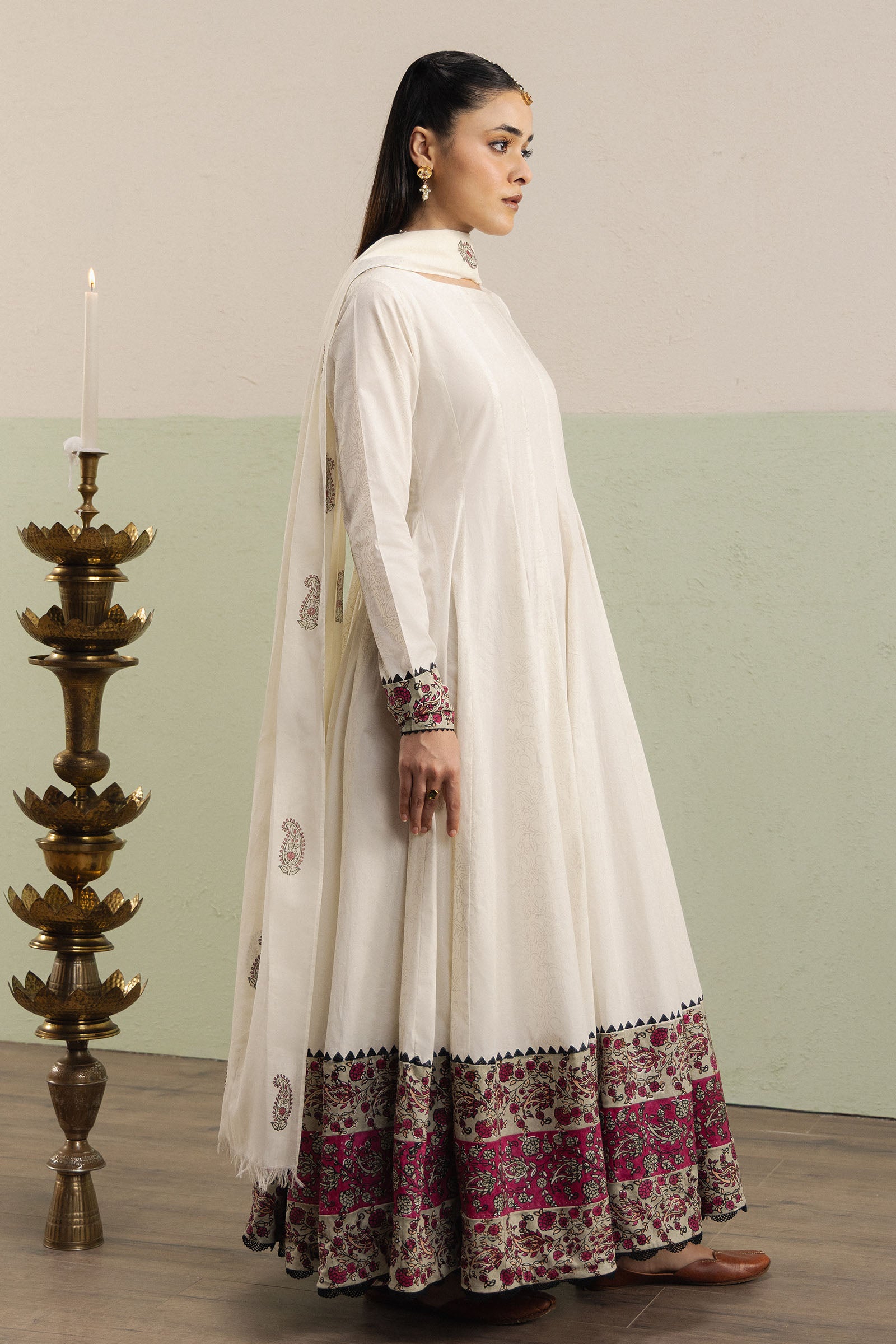 Fiza is an off-white, full-length Anarkali in airy voile, featuring full fitted sleeves and decorative borders along the hem and sleeve edges that add subtle refinement. Paired with a cambric choridaar adorned with a diagonal-lined hand-crafted print, the ensemble strikes a harmonious balance between tradition and contemporary ease. The paisley-spray swiss voile dupatta completes the look, enhancing the flowing silhouette with ethereal charm and festive grace.