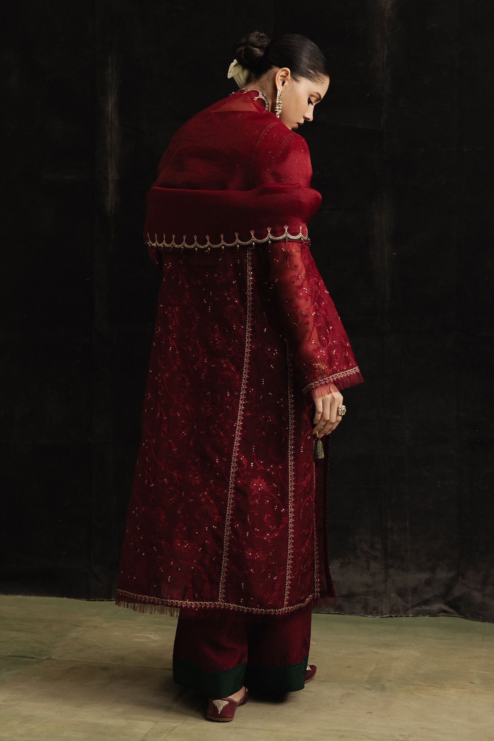 The look is completed with a korean raw silk shalwar, accented with green colour-blocked scalloped detailing. A sheer organza dupatta, finished with scalloped edges on all four sides, completes the ensemble striking the perfect balance between elegance and statement. Option of full underlining is available.