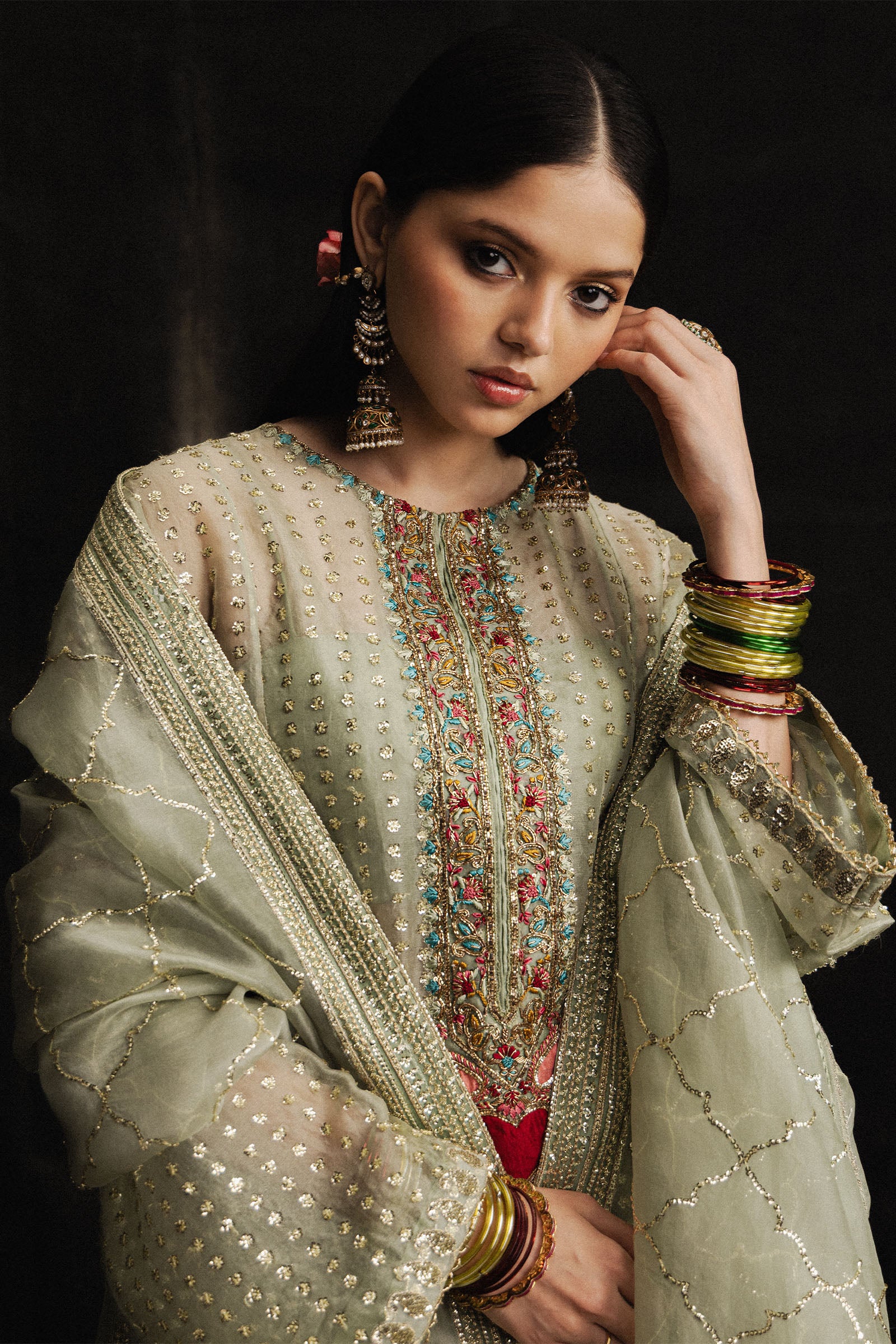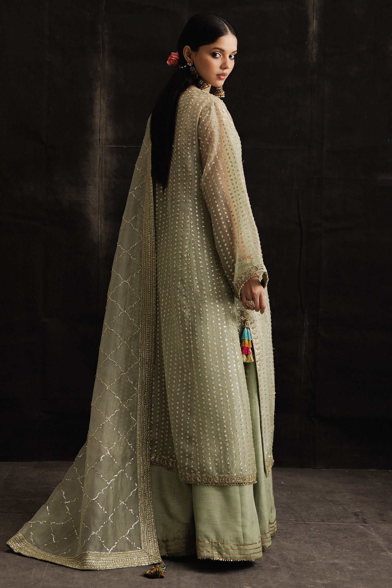 It is paired with a korean raw silk sharara, finished with classic gotta accents that lend graceful movement. The look is completed with an embroidered pure organza dupatta, adorned with an all-over sequins jaal that catches the light beautifully, adding a touch of understated glamour.