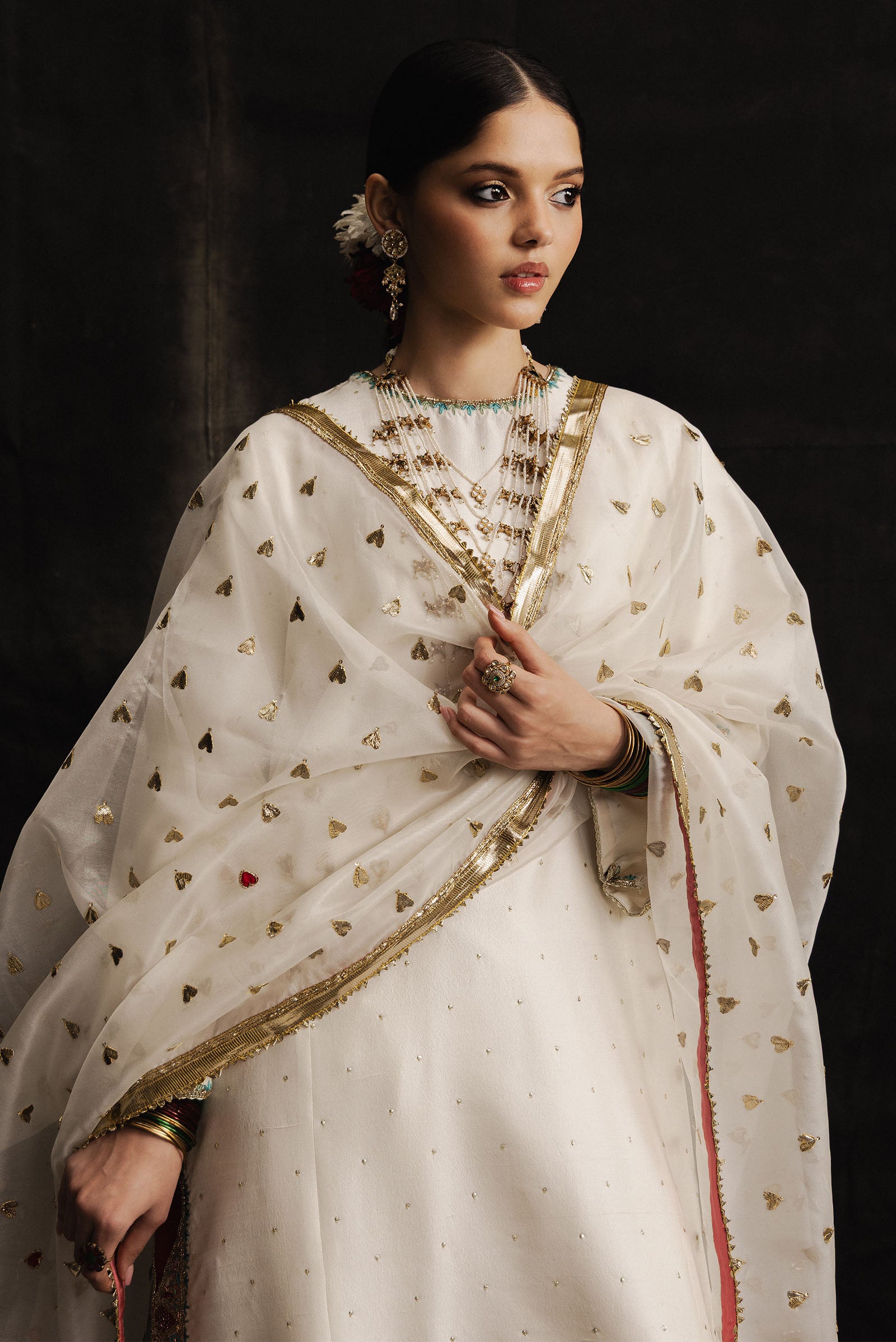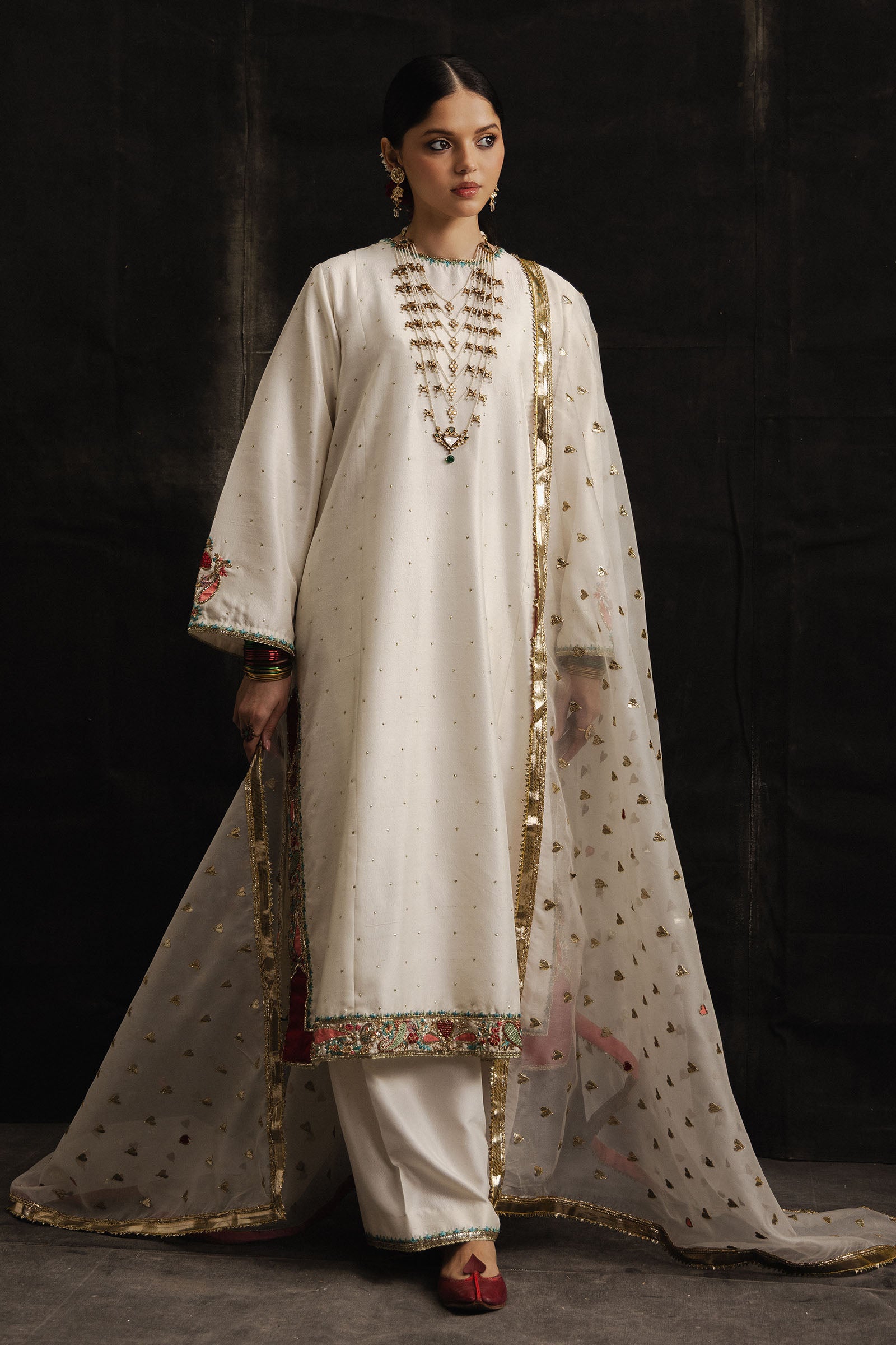 It is paired with a pure raw silk shalwar, adorned with subtle adda details, maintaining a balanced and elegant silhouette. The look is completed with a sheer pure organza dupatta, finished with delicate gotta appliqué that imparts just the right hint of festive charm.