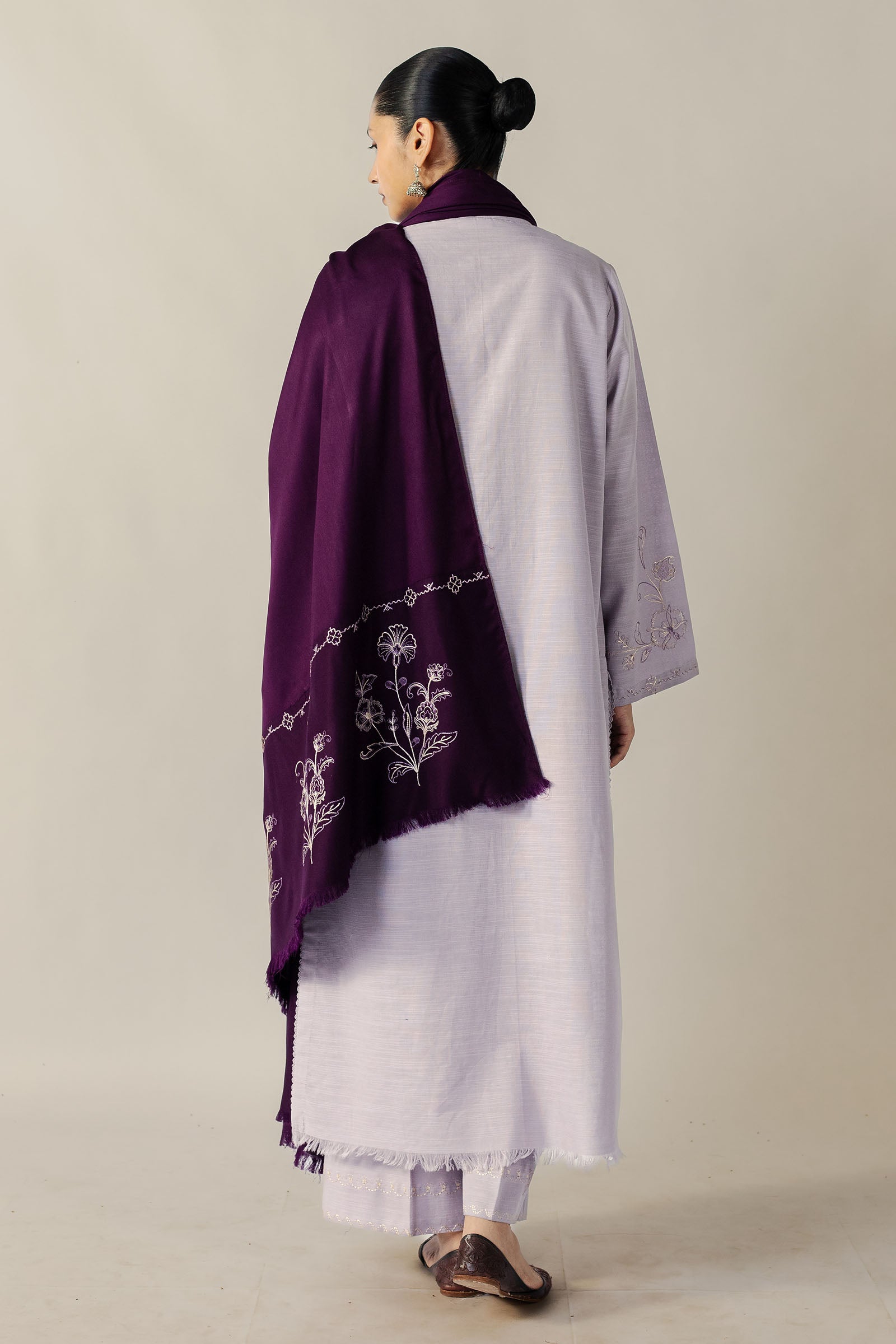 Our loose fit, long shirt adorned with intricate all-over embroidery, paired with minimal embroidered wide hem pants for a harmonious silhouette. The shawl features exquisite embroidery on the pallu, completing this timeless ensemble.