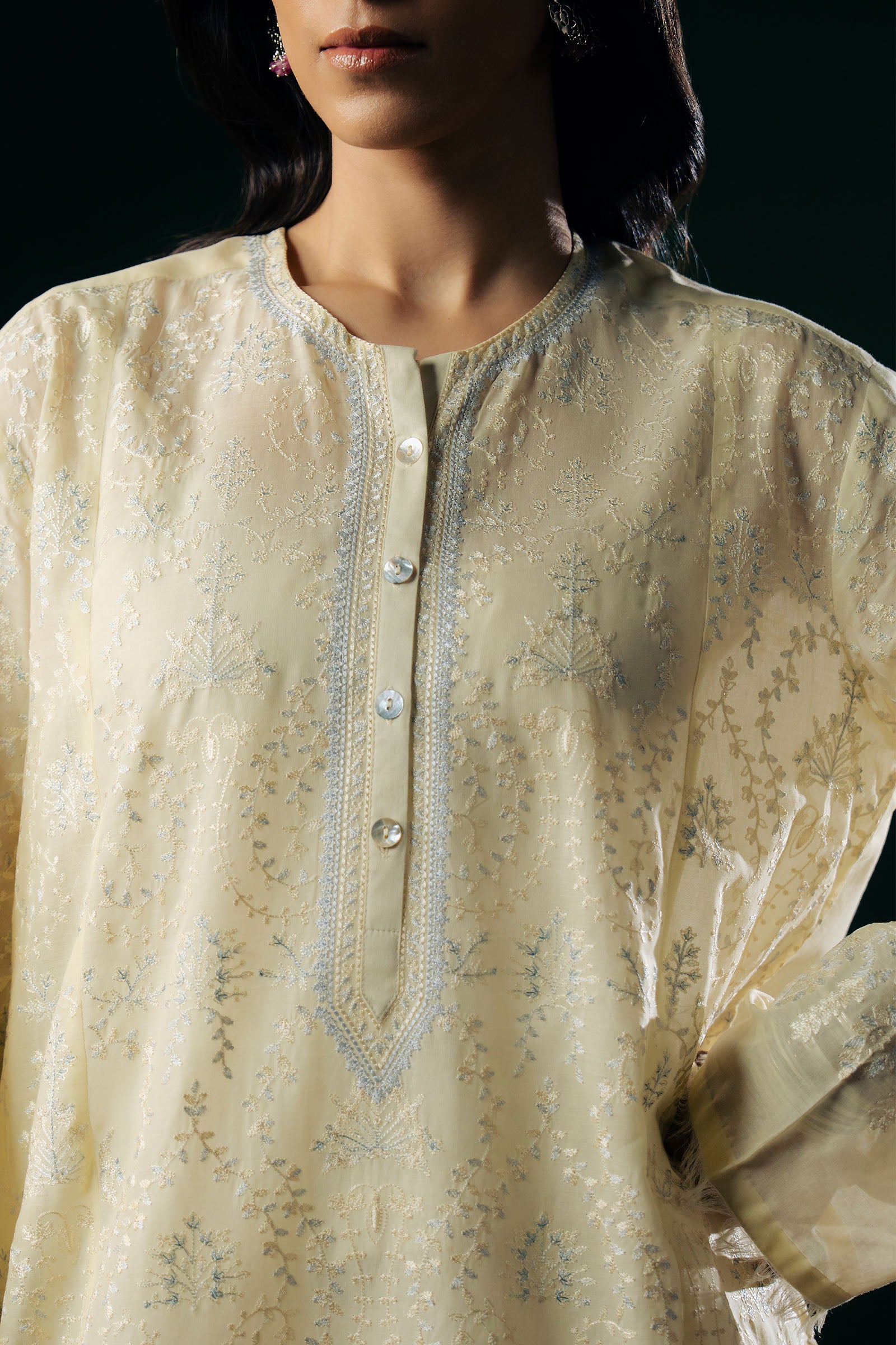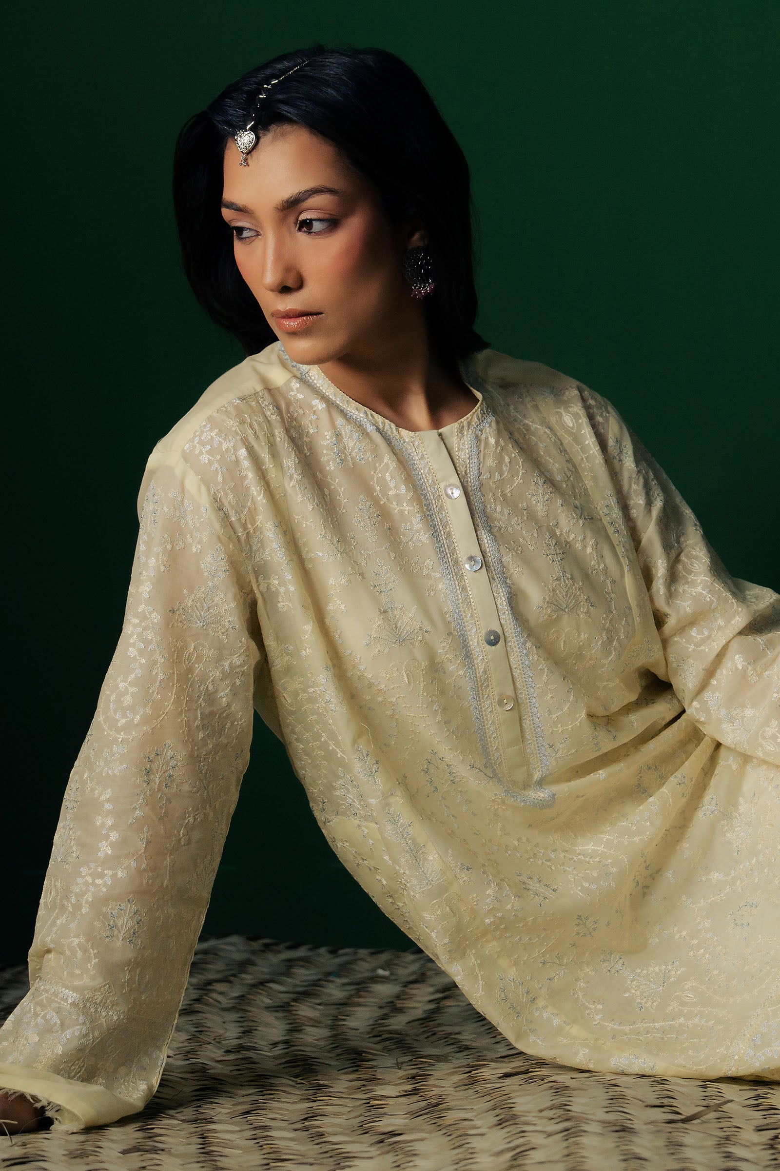 Taza is a fresh, bold lime kurta designed to make a statement while embracing effortless wearability. Crafted in a short, boxy silhouette, it offers a modern, relaxed fit that is both comfortable and stylish. The vibrant lime base is adorned with intricate Kashmiri-style embroidery arranged in an all-over jaal, creating a rich tapestry of texture and artisanal detail. Each motif is thoughtfully placed, giving the kurta depth and character, while maintaining a balanced, wearable look.
