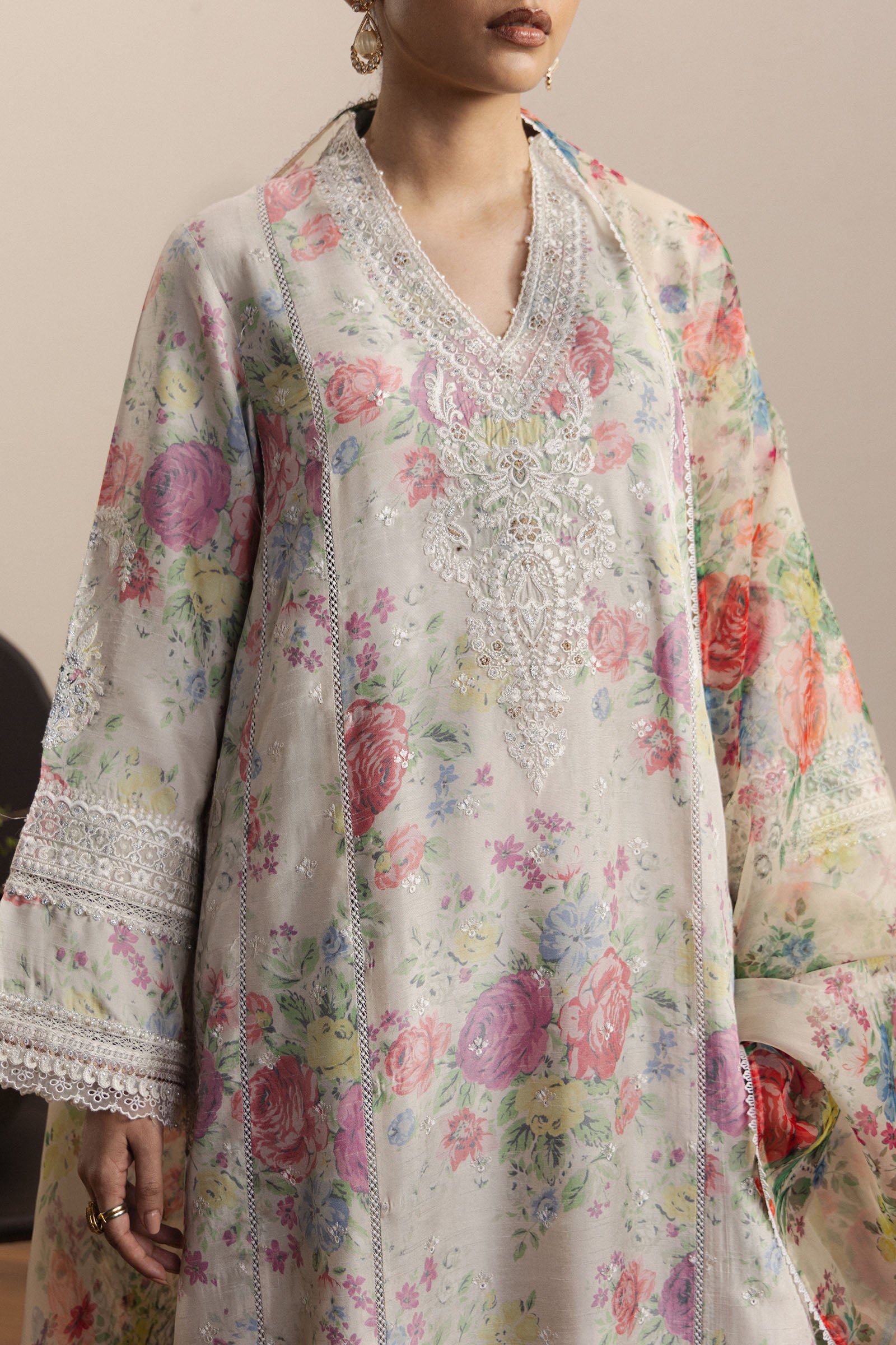 Paired with an embroidered raw silk shalwar, the silhouette remains elegant and balanced, allowing the detailing of the shirt to take centre stage. The look is completed with a luxurious organza dupatta, finished with an embroidered pallu that adds a soft, celebratory flourish.