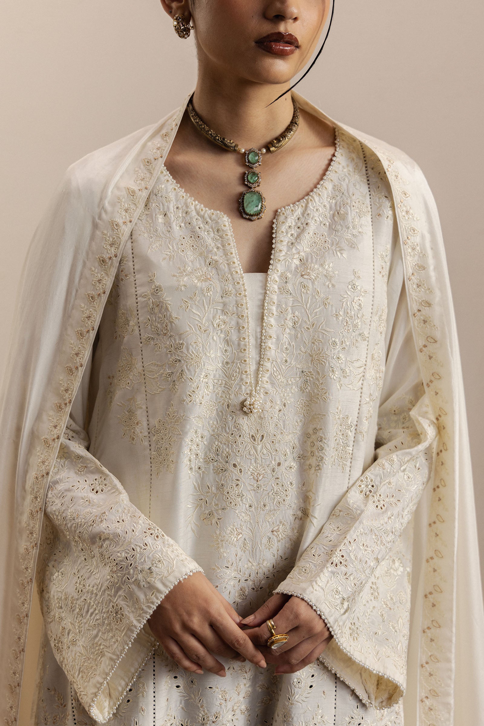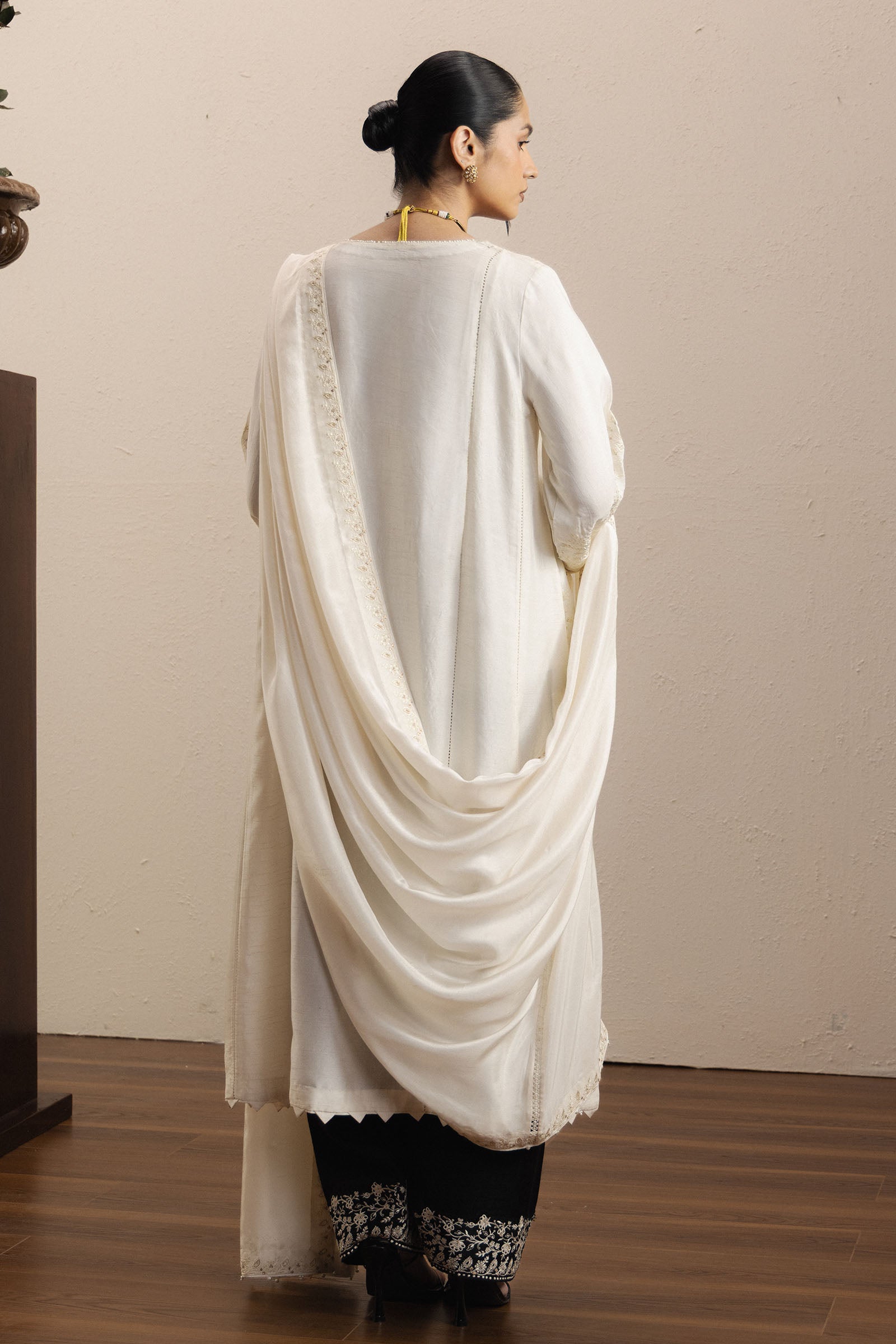 An ivory ensemble that seamlessly blends traditional craftsmanship with modern elegance, offering a silhouette that feels both timeless and refined. The medium raw silk shirt is exquisitely detailed with resham and tilla chikankari embroidery, lending depth, texture, and cultural richness to the design while maintaining a soft, graceful aesthetic.