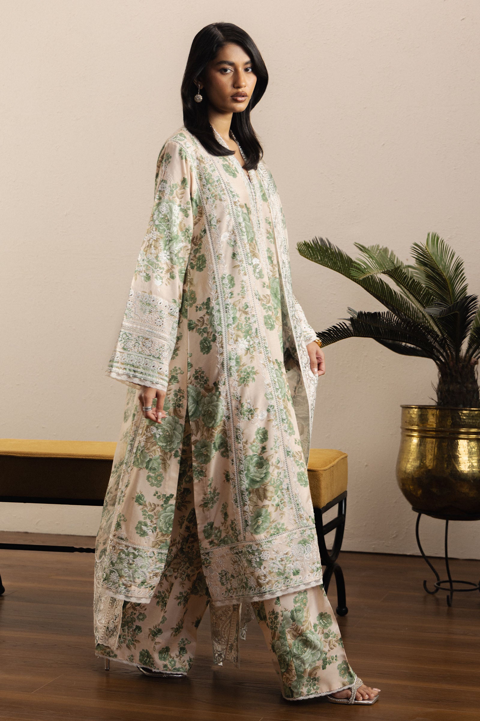 A floral-printed ivory ensemble that radiates understated elegance and timeless sophistication. The medium raw silk shirt is delicately adorned with resham and badla embroidery, enhanced with net lace and subtle pearl finishing, creating a harmonious fusion of texture and refinement.