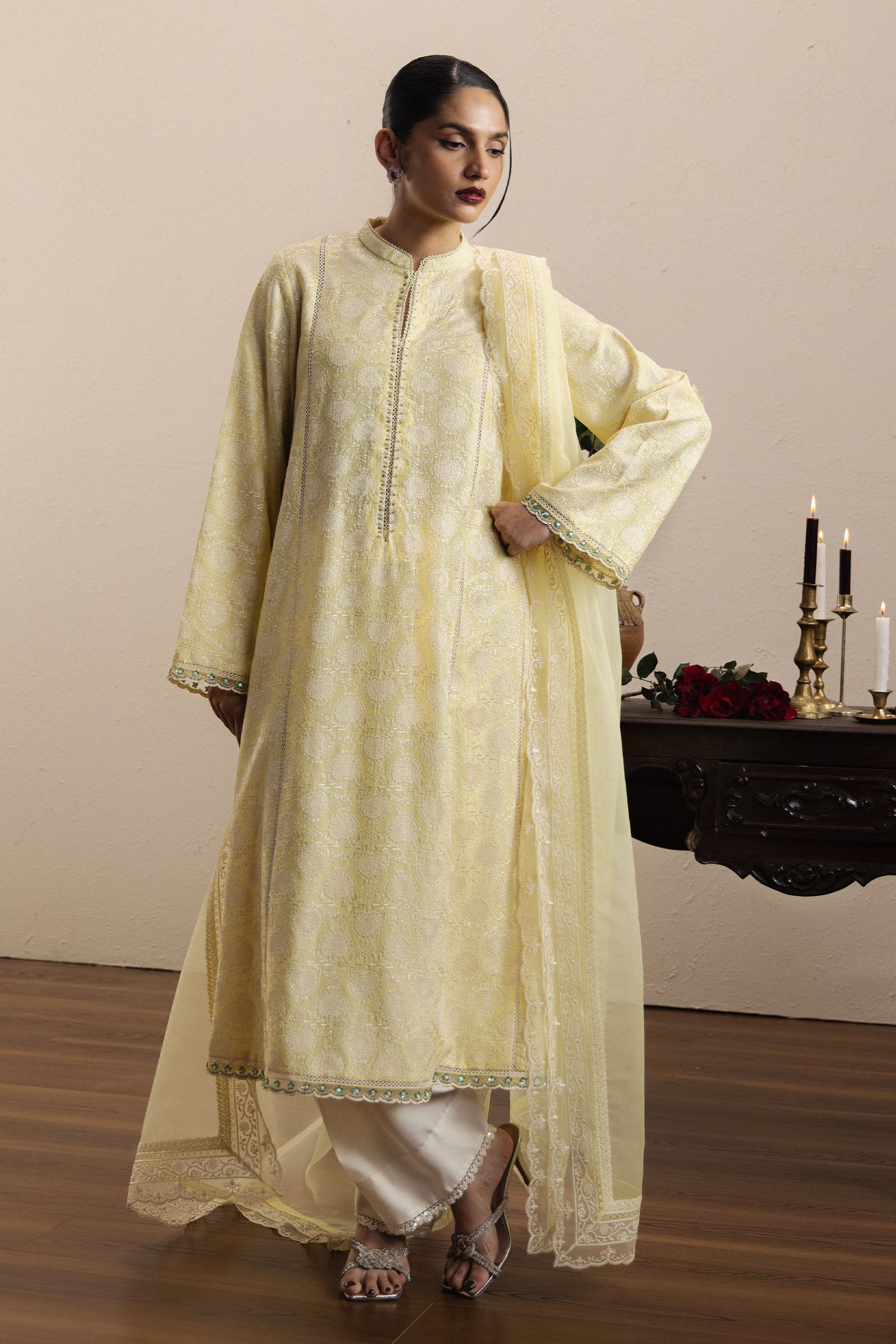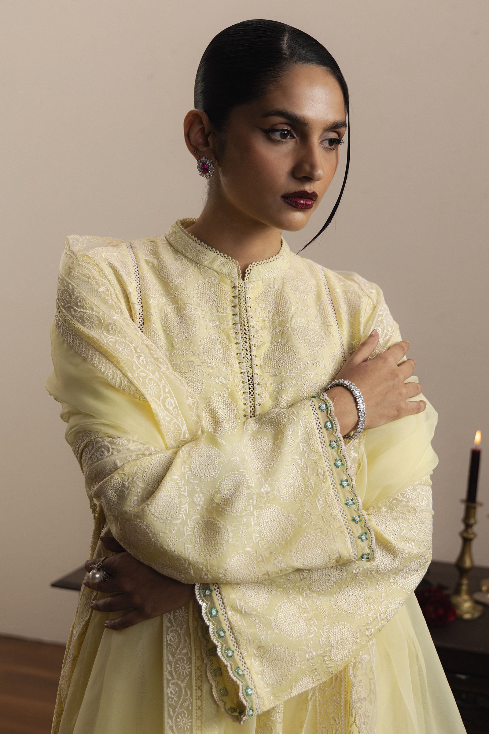 Zahra is a long, paneled raw silk kameez in vibrant yellow, featuring delicate chikankari embroidery on the front and sleeves with subtle organza accents, creating a silhouette that exudes elegance and refinement. Paired with tapered shalwar pants adorned with complementary embroidery, the ensemble flows gracefully while offering modern comfort.