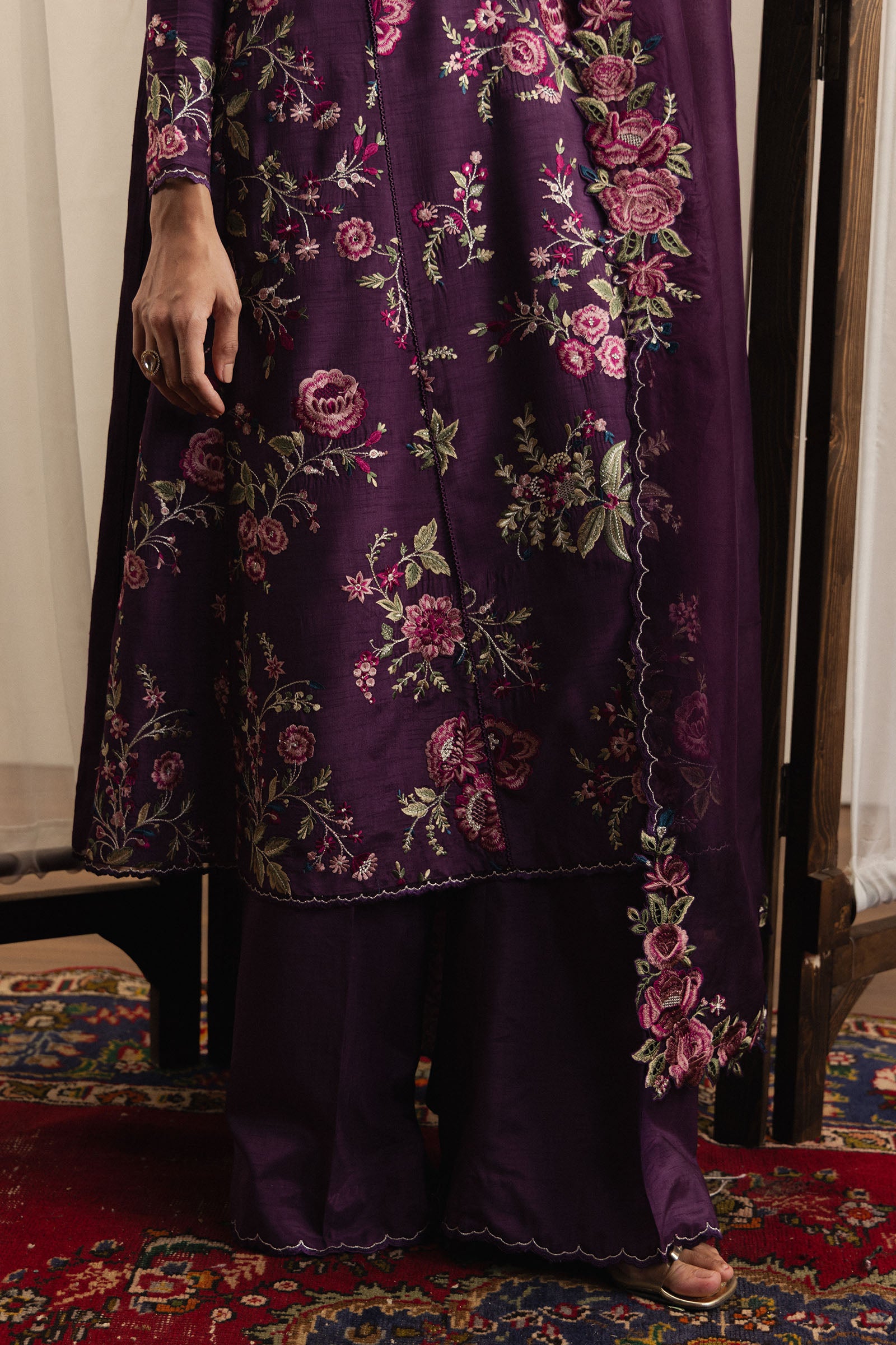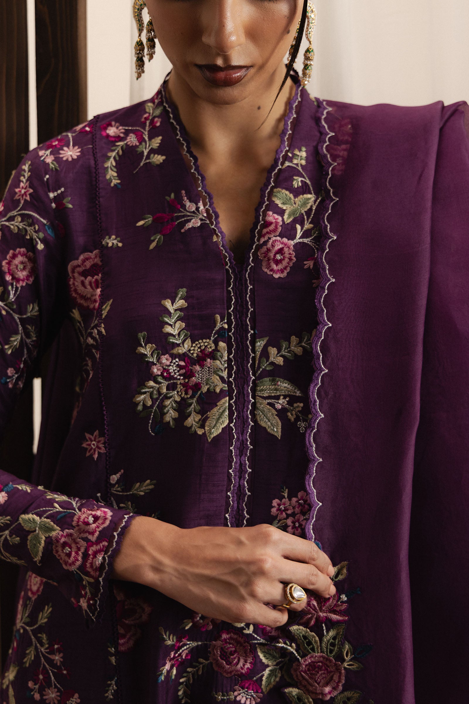 Shabnam is a luxurious plum raw silk ensemble, featuring a long, panelled kameez that elegantly balances tradition and contemporary refinement. The front and sleeves are adorned with delicate embroidery, enhanced with subtle organza accents that lend depth, texture, and a soft shimmer to the design.