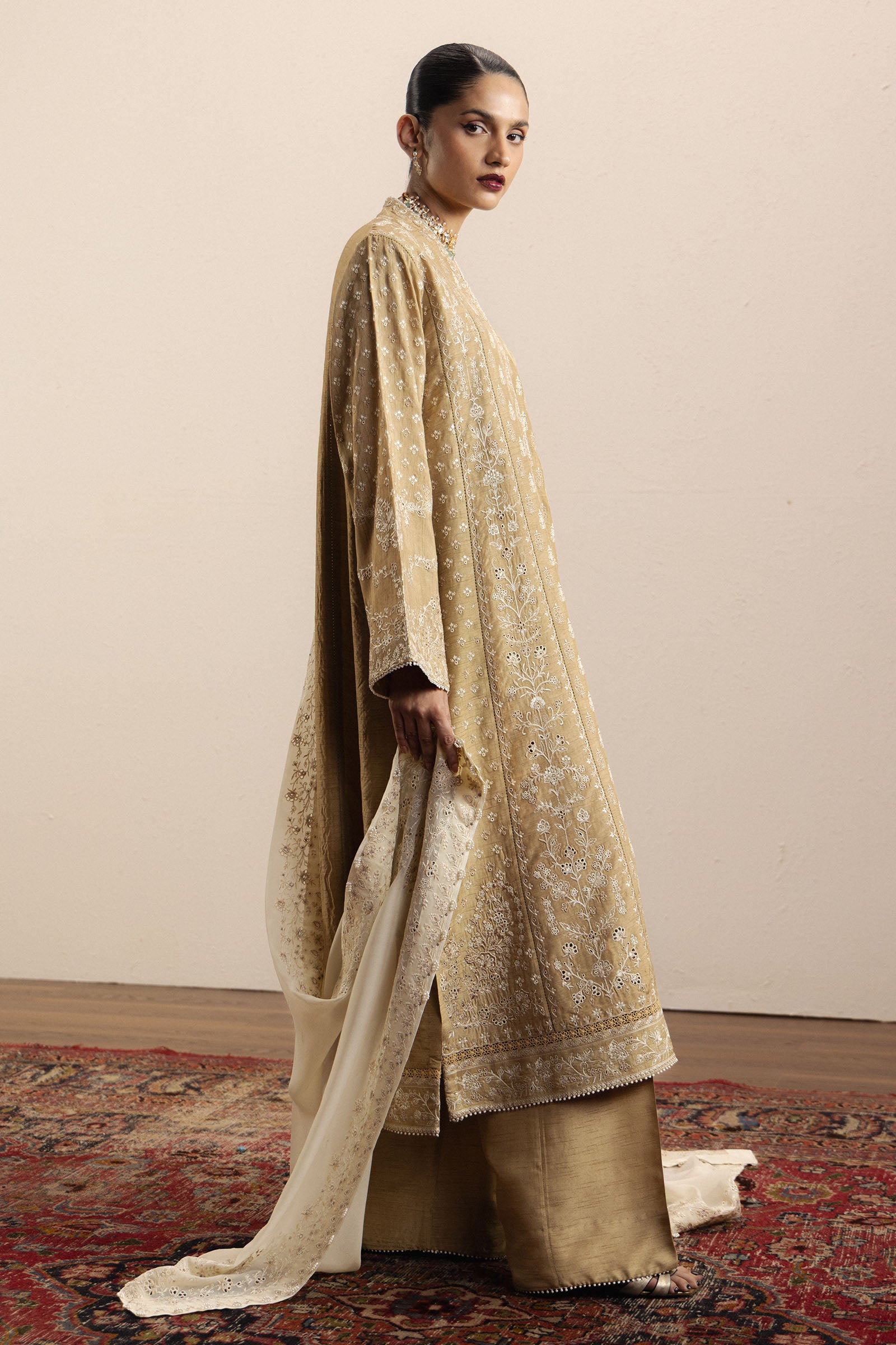 Paired with loose-fit medium raw silk pants, the silhouette offers relaxed elegance while maintaining refinement. The look is completed with an ivory chiffon georgette dupatta, intricately embroidered and enhanced with delicate pearl accents, adding softness and luminous detail to the ensemble.