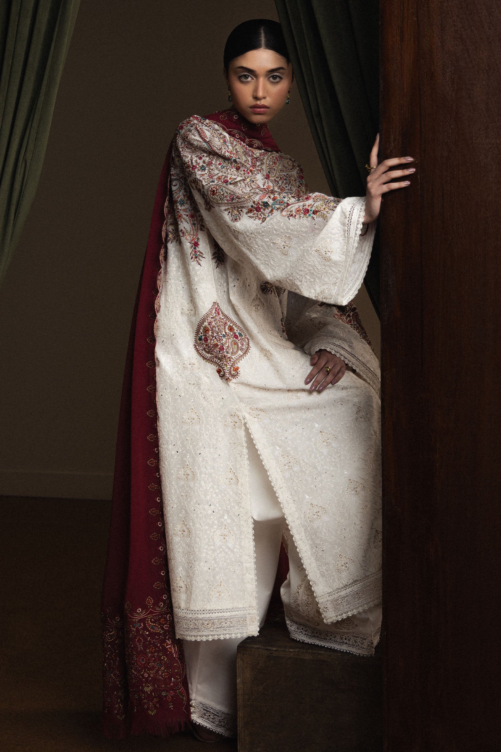 Hikari is crafted in white with Kashmiri and kashidakari-inspired embroidery, paired with a terracotta embroidered dupatta adorned with delicate Kashmiri motifs. Detailed with organza borders, embroidered panels, and matching dyed cambric trousers, the ensemble exudes heritage-rooted sophistication and understated elegance.