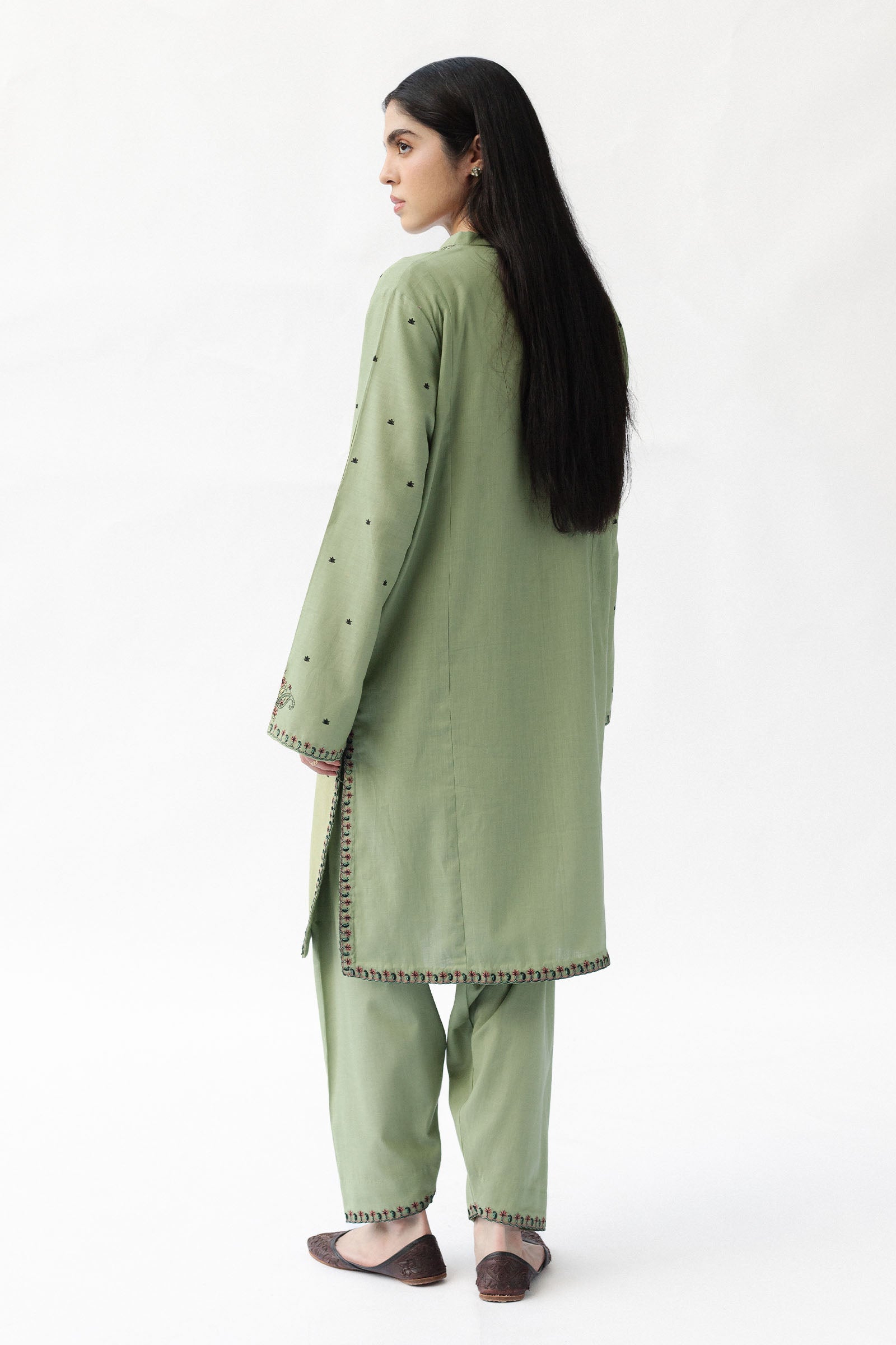 A sage green two-piece linen suit featuring delicate Kashmiri embroidery along the neckline and sleeves, offering a soft, refined look perfect for everyday elegance.